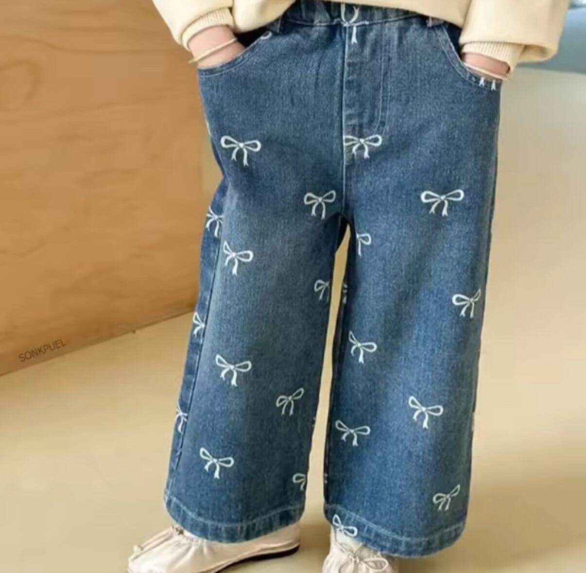 リボン柄デニムストレートパンツ
